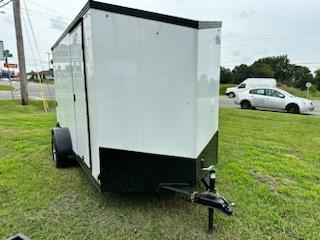 This trailer is a WHITE 6x12 single axle cargo trailer with 24" slant wedge nose, .030 screwless smooth aluminum exterior...